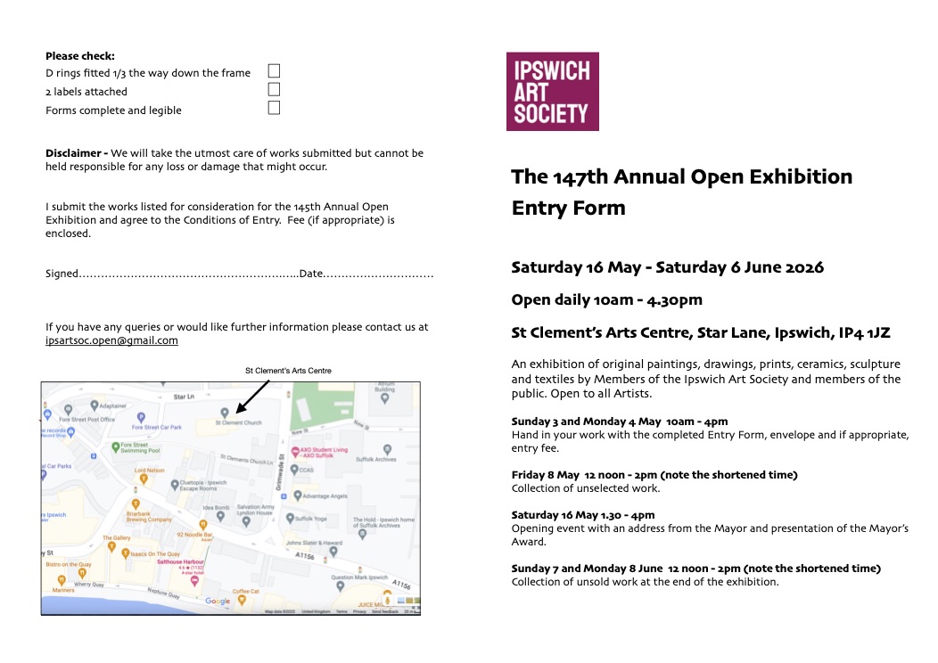 An exhibition of original paintings, drawings, prints, ceramics, sculpture and textiles by members of the the Ipswich Art Society and members of the public. Open to all Artists
