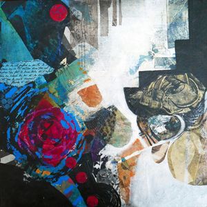 These works are built up with abstracted layers of paint, mixed media and collage, so that beneath the surface lies history and information which can sometimes be glimpsed at through glazing or sanding back through surface layers. Whispers of thought shadows which can be barely glimpsed.